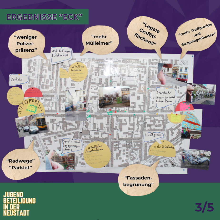 An den Beteiligungsaktionen nahmen rund 90 Kinder, Jugendliche und junge Erwachsene zwischen 4 und 27 Jahren teil. Bei den Stadtteilspaziergängen entstanden rund 50 Fotoaufnahmen von Orten, die jungen Menschen besonders gefallen oder die sich aus ihrer Sicht verändern sollten. Das Amt für Stadtplanung und Mobilität wertet die Ergebnisse der ersten Beteiligungsphase nun aus und lässt sie in die weitere Planung einfließen. Noch im Herbst diesen Jahres startet die 2. Phase der Beteiligung an der Umgestaltung in. Checkt also gern unsere Info-Kanäle und lest, was es zum Thema Neues gibt.