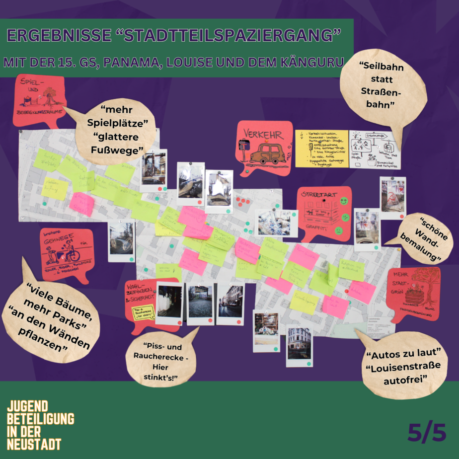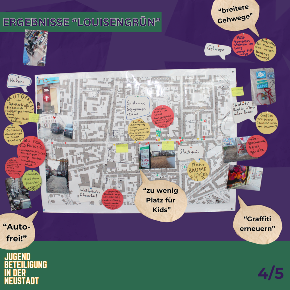 Im Auftrag und in Zusammenarbeit mit dem Amt für Stadtplanung und Mobilität haben wir junge Menschen aus der Neustadt zu ihren Wünschen für die Umgestaltung der Louisenstraße befragt. Mit verschiedenen Beteiligungsangeboten wurden Kinder, Jugendliche und junge Erwachsene dazu eingeladen, uns ihre Wünsche und Hinweise mitzuteilen.